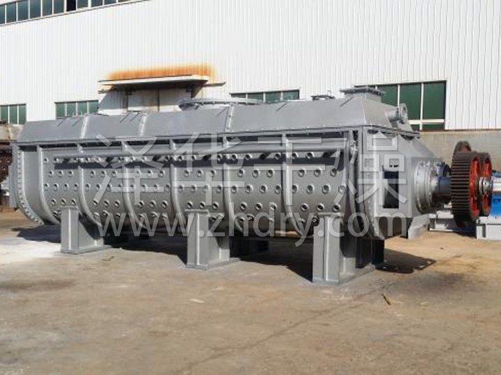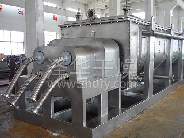 空心軸上密集排列著楔型中空漿葉,熱介質(zhì)經(jīng)空心軸流經(jīng)漿葉。單位有效容積內(nèi)傳熱面積很大,熱介質(zhì)溫度從-40℃到320℃,可以是水蒸汽,也可以是液體型:如熱水、導(dǎo)熱油等。間接傳導(dǎo)加熱,沒(méi)有攜帶空氣帶走熱量,熱量均用來(lái)加熱物料。熱量損失僅為通過(guò)器體保溫層向環(huán)境的散熱。楔型漿葉傳熱面具有自清潔功能。物料顆粒與楔型面的相對(duì)運(yùn)動(dòng)產(chǎn)生洗刷作用,能夠洗刷掉楔型面上附著物料,使運(yùn)轉(zhuǎn)中一直保持著清潔的傳熱面。漿葉干燥機(jī)的殼體為Ω型,殼體內(nèi)一般安排二到四根空心攪拌軸。殼體有密封端蓋與上蓋,防止物料粉塵外泄而充分發(fā)揮作用。